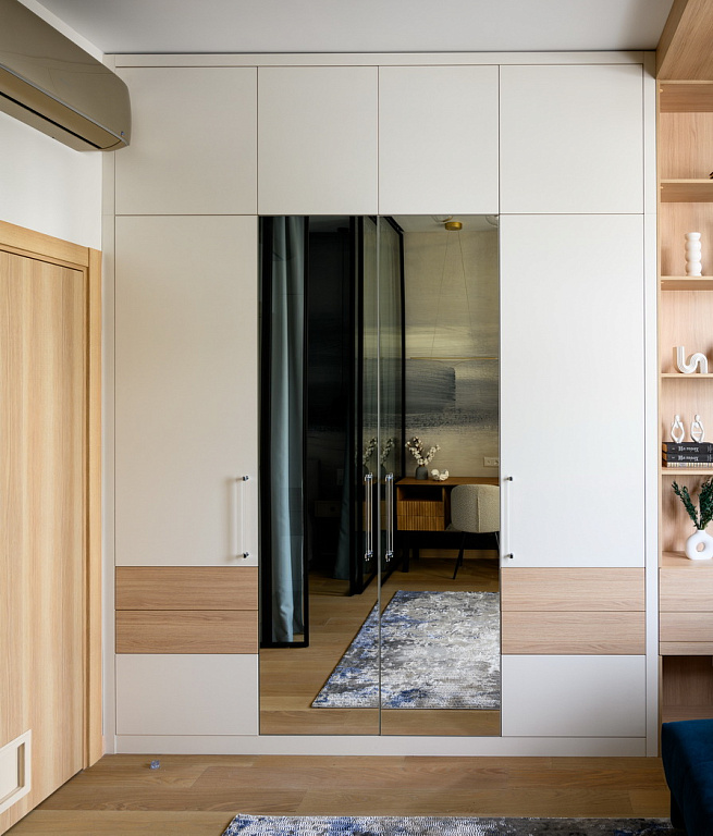 В большой комнате дизайнер Марина Поклонцева и команда «Квартирного вопроса» сделали спальню, кабинет, миниатюрную детскую и даже пентхаус для кота. А заодно обновили соседнюю комнату, куда переедет бабушка.