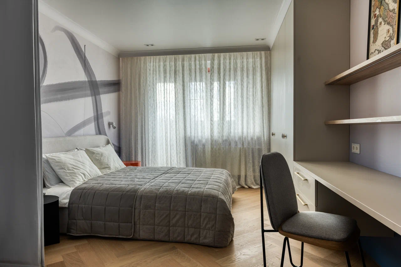 Для реализации проекта спальни дизайнер Марина Кутузова выбрала кварцевый паркет Дуб Лимба. Нейтральное светлое дерево стало идеальной платформой для реализации задумки с чёрными акцентами и контрастной стеной с каллиграфией, вокруг которой и построен весь интерьер.