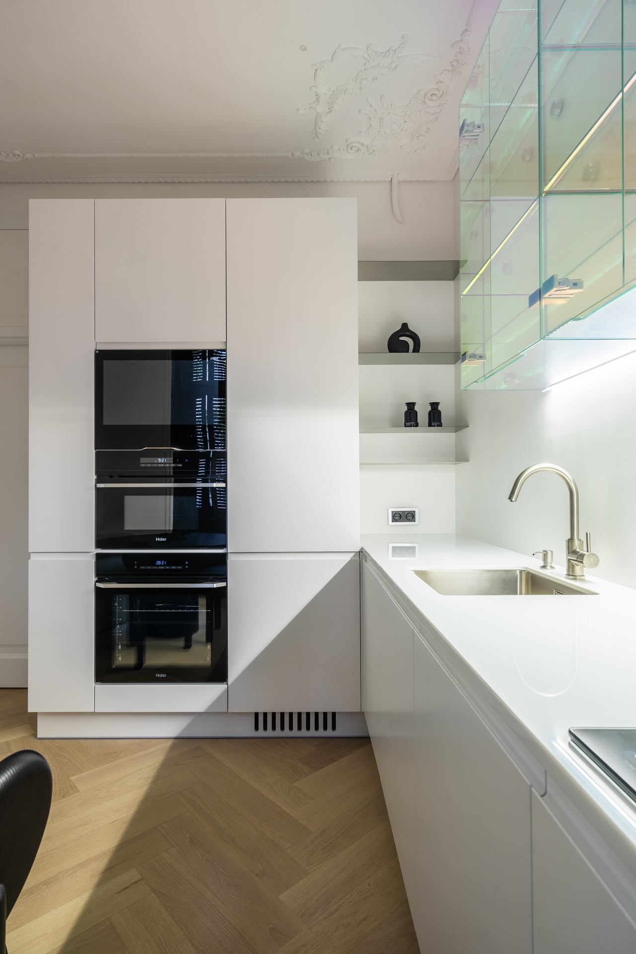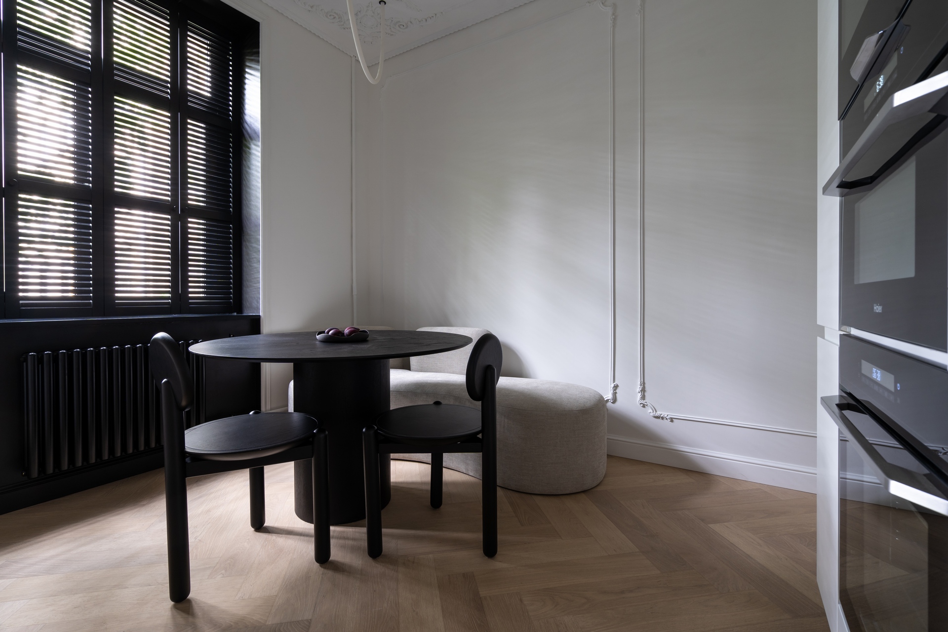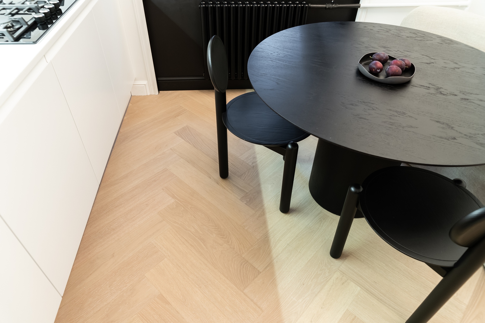 Контрастную чёрно-белую кухню разбавили лепной декор и уютный пол из натурального дерева, уложенный английской ёлочкой — кварцпаркет Quartz Parquet Дуб Испанский 33-404