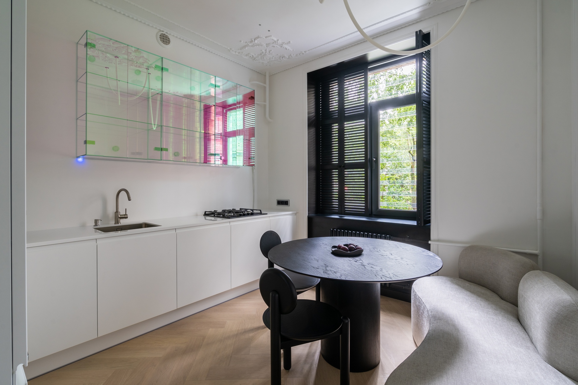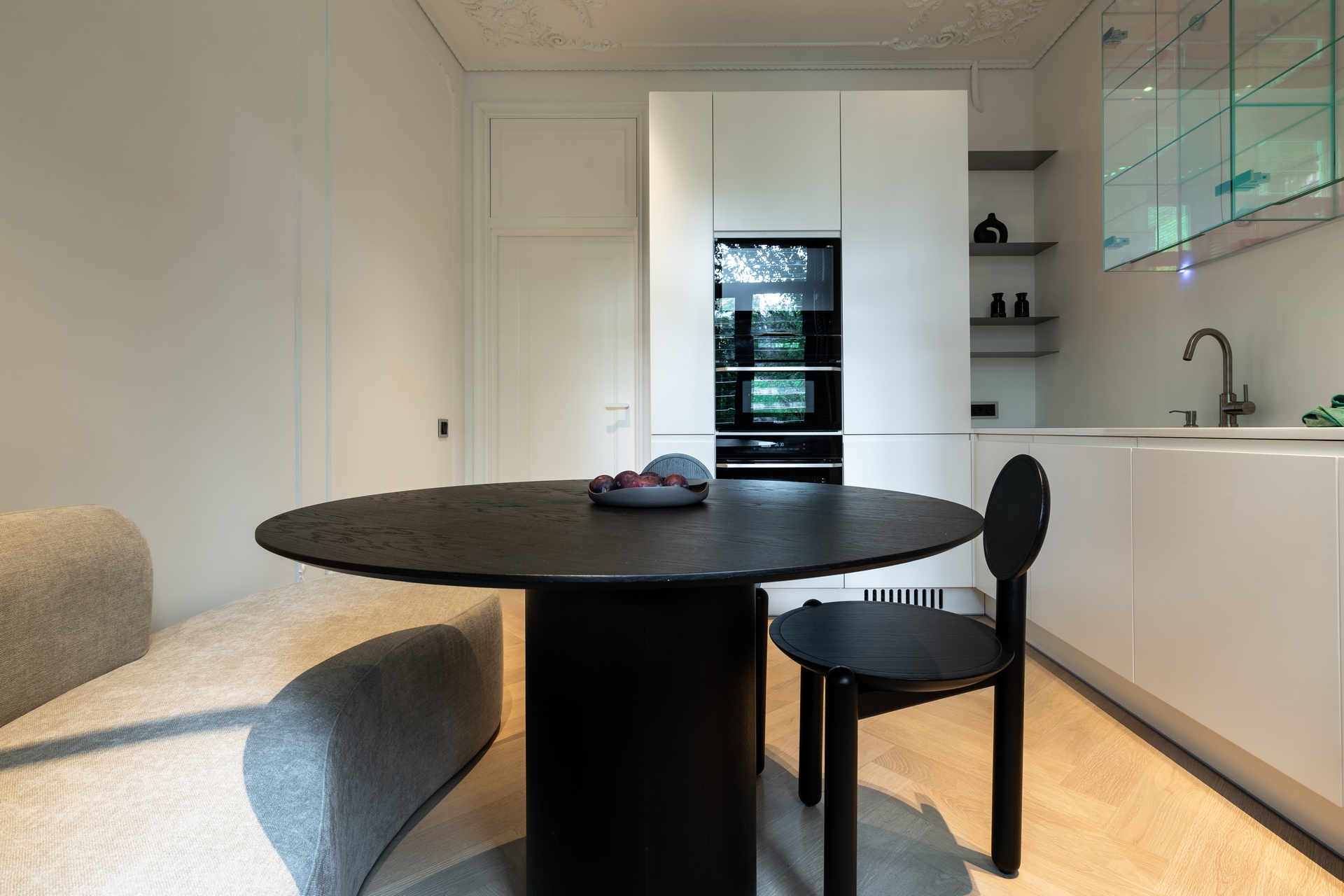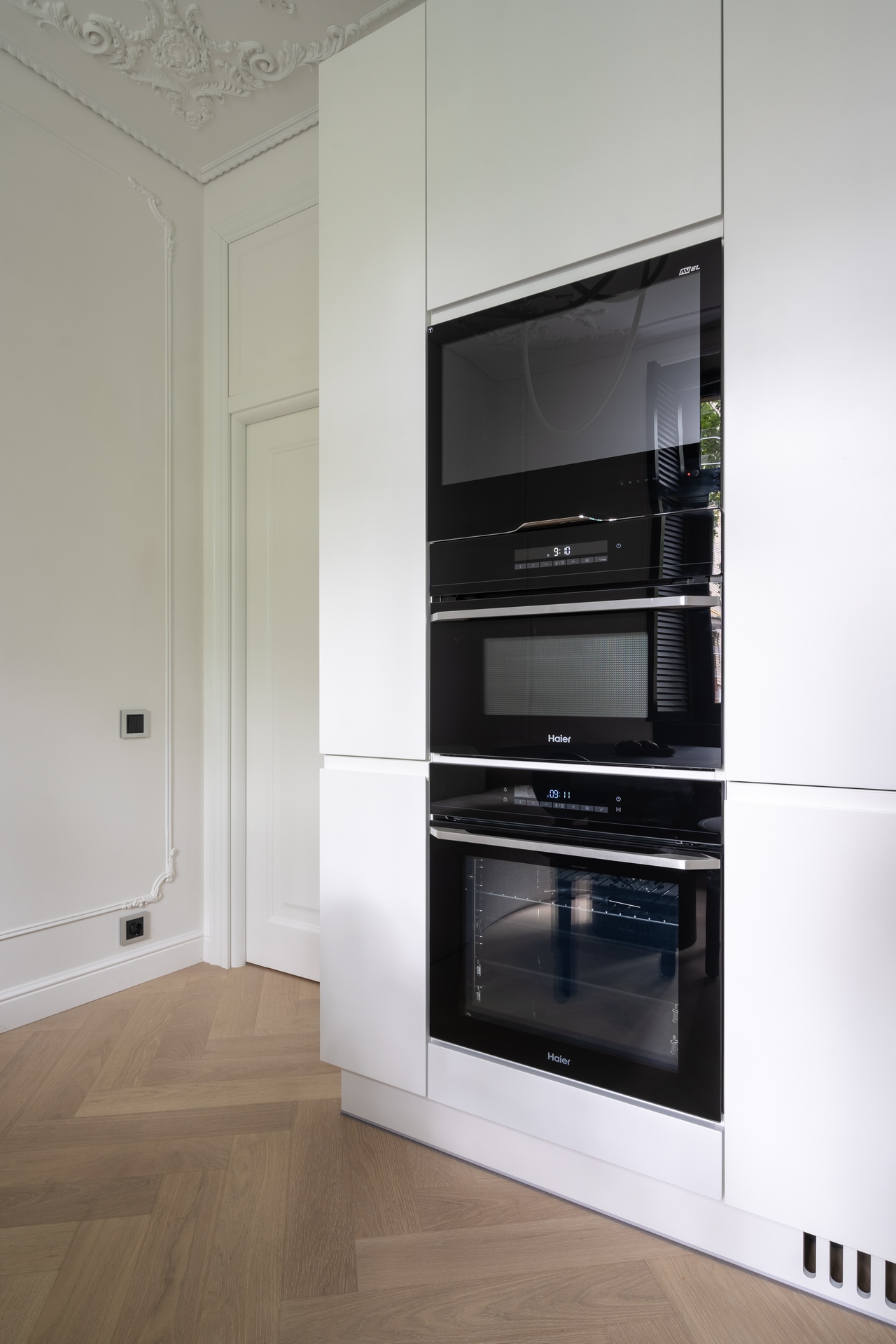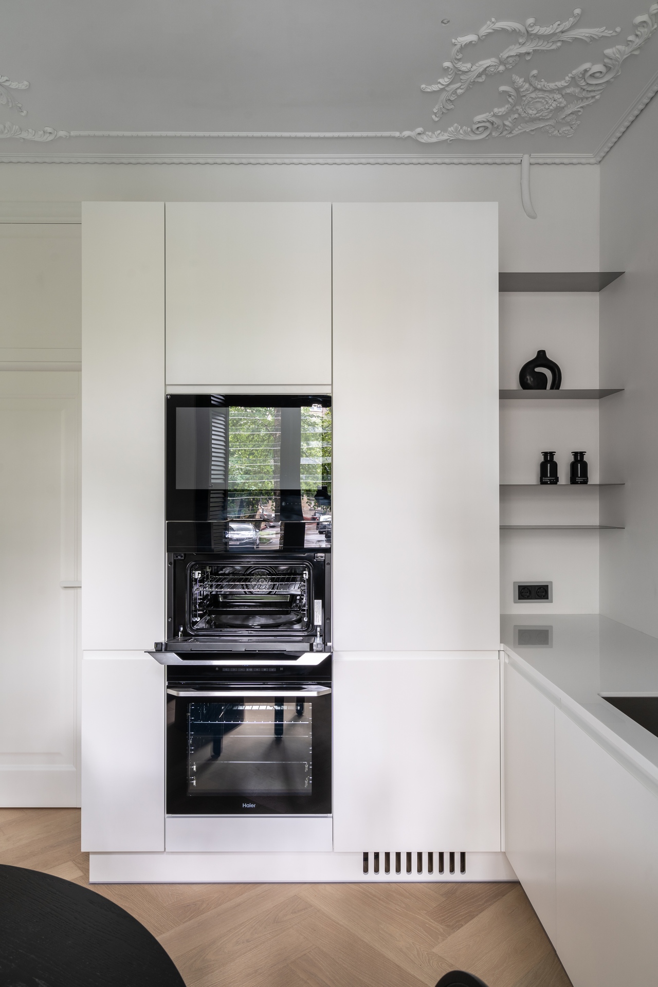 Контрастную чёрно-белую кухню разбавили лепной декор и уютный пол из натурального дерева, уложенный английской ёлочкой — кварцпаркет Quartz Parquet Дуб Испанский 33-404